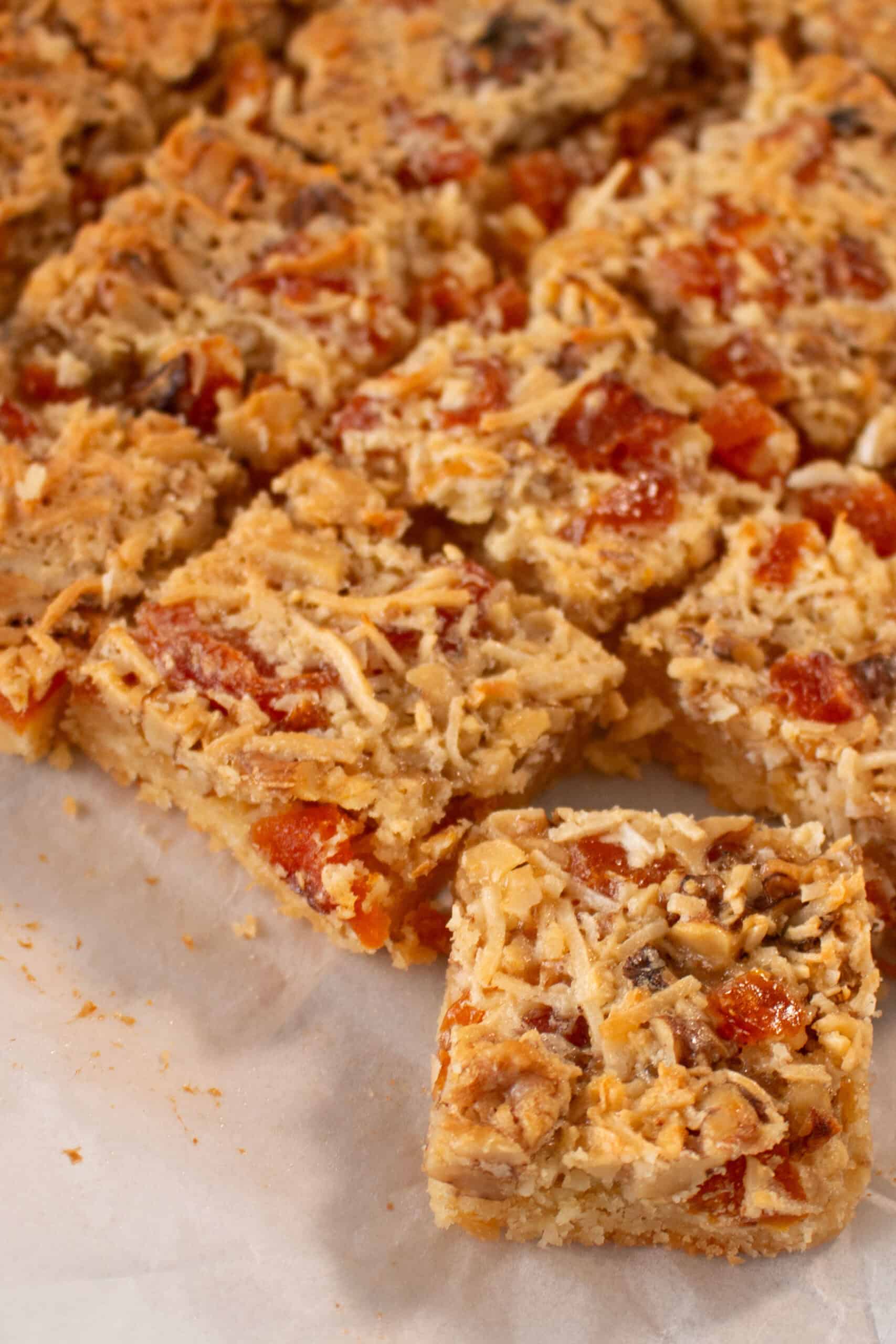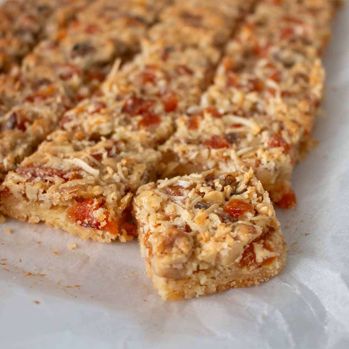 A wholesome dried apricot and walnut slice studded with tender pieces of naturally sweet dried apricots, crunchy toasted walnuts and the subtle flavour of coconut all combined on a buttery biscuit base. The coconut adds a gentle sweetness and subtle texture that perfectly complements the nutty richness and bright fruit flavor. Soft, chewy, and satisfying, this slice is a delicious balance of sweet and nutty in every bite.
