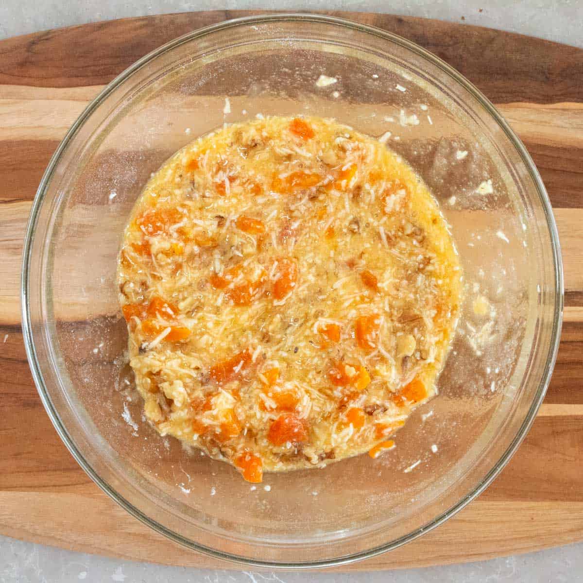 Step 6: Combine apricot, walnuts, coconut, sifted flour, sugar and salt together, then add beaten eggs. Stir to combine.