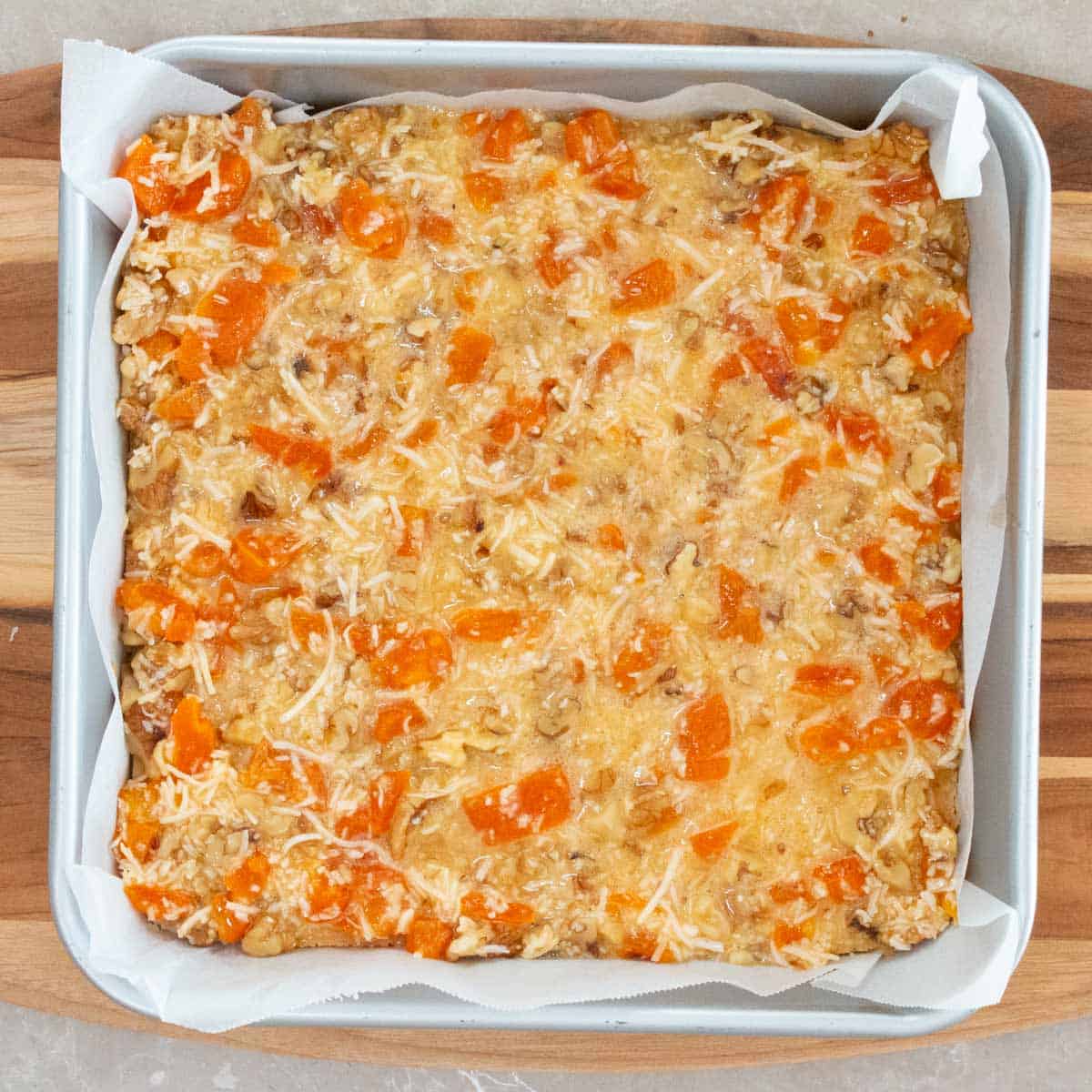 How to make Apricot & Walnut Slices step two: spread dough in a square baking pan