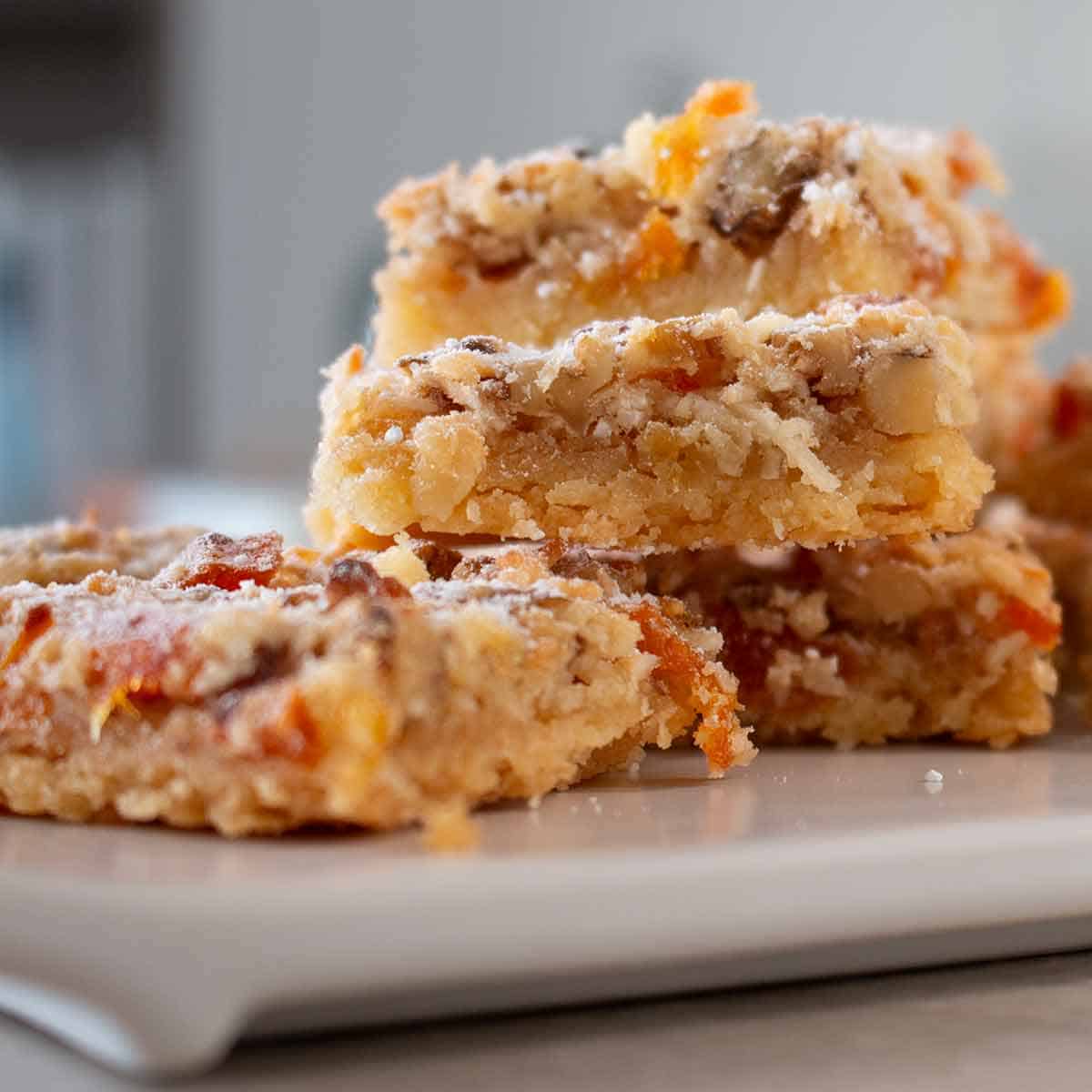 Apricot & Walnut Slices pilled up on a white plate