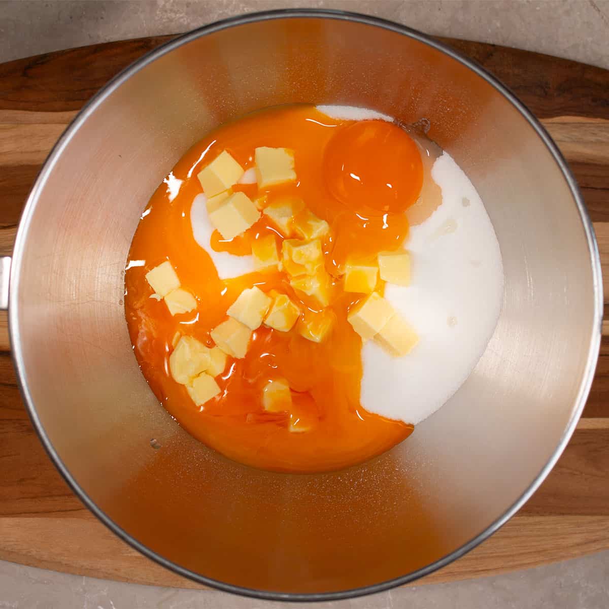 Step 1: Beat the eggs yolks, sugar and butter together with a handheld electric beater or a stand mixer until they are combined.
