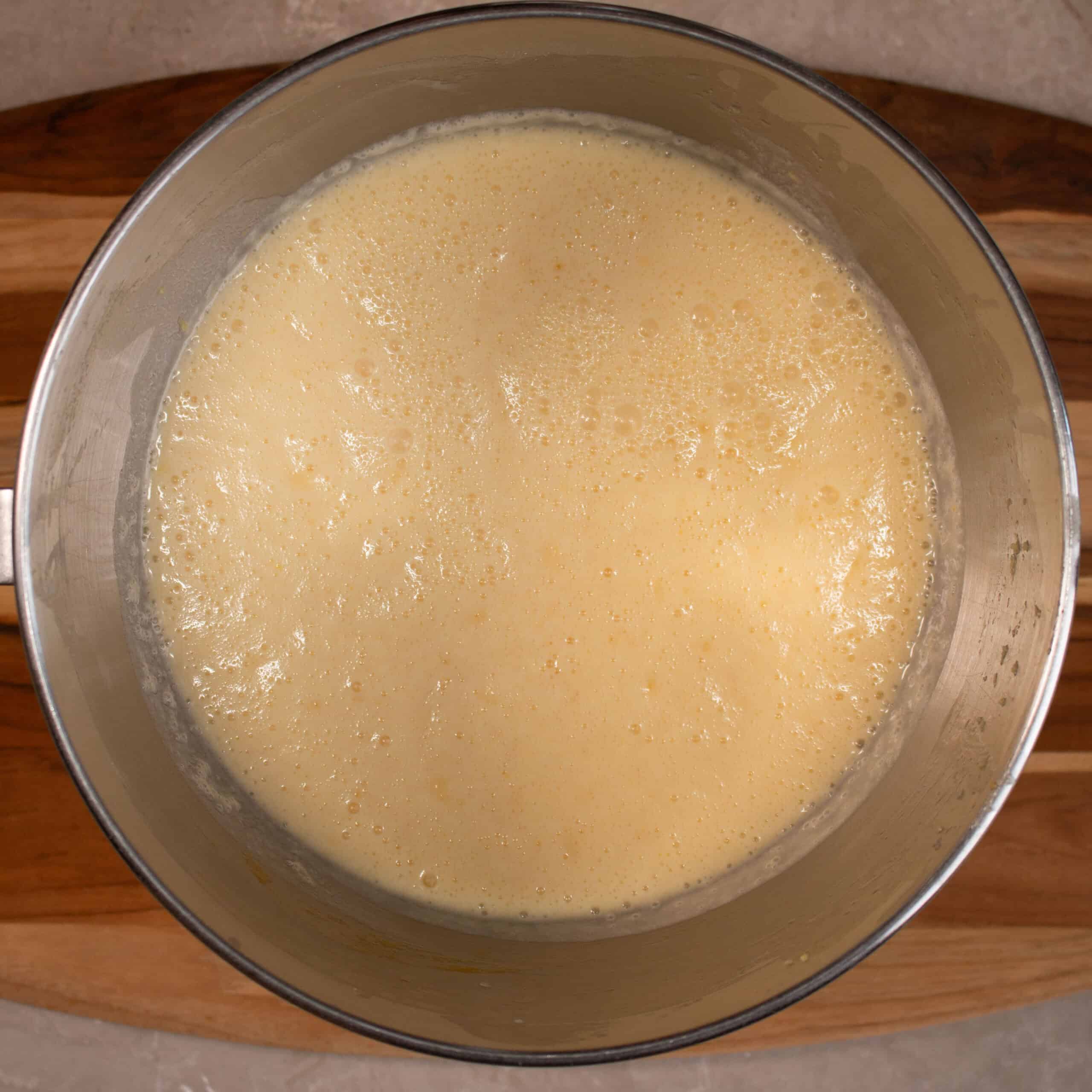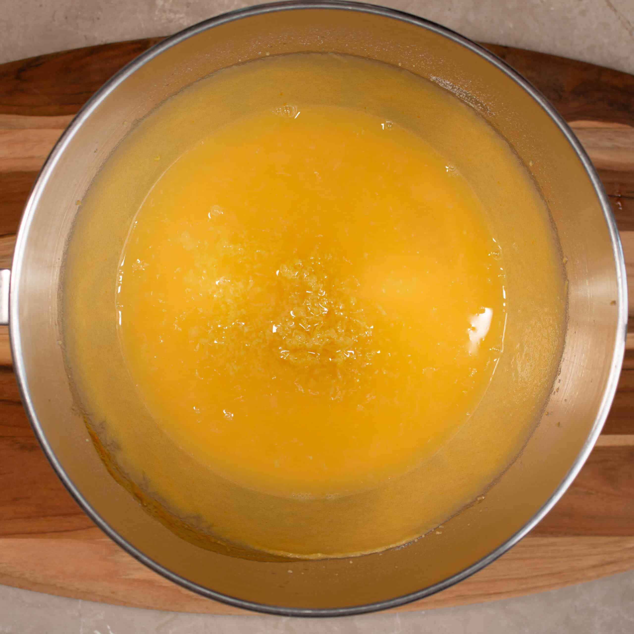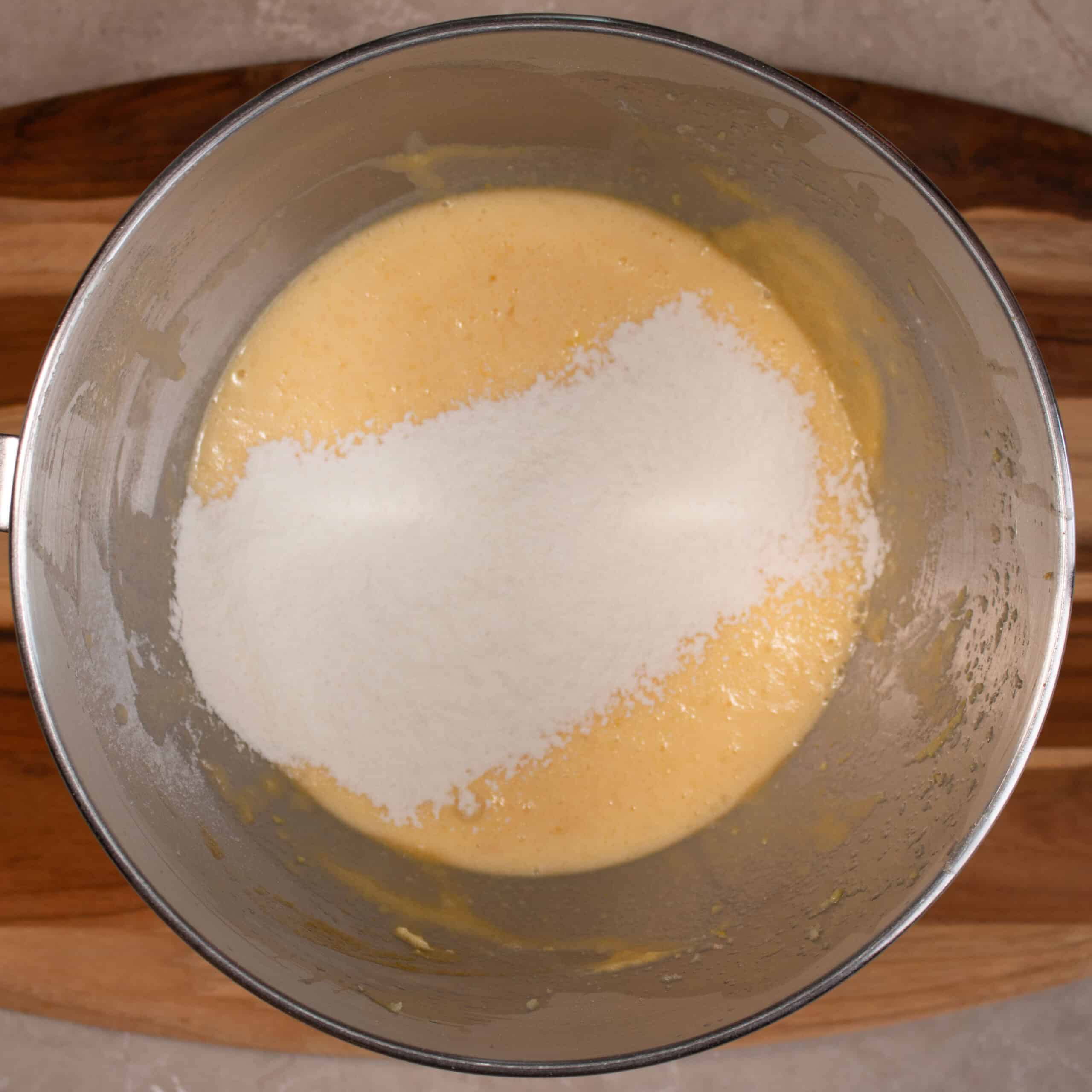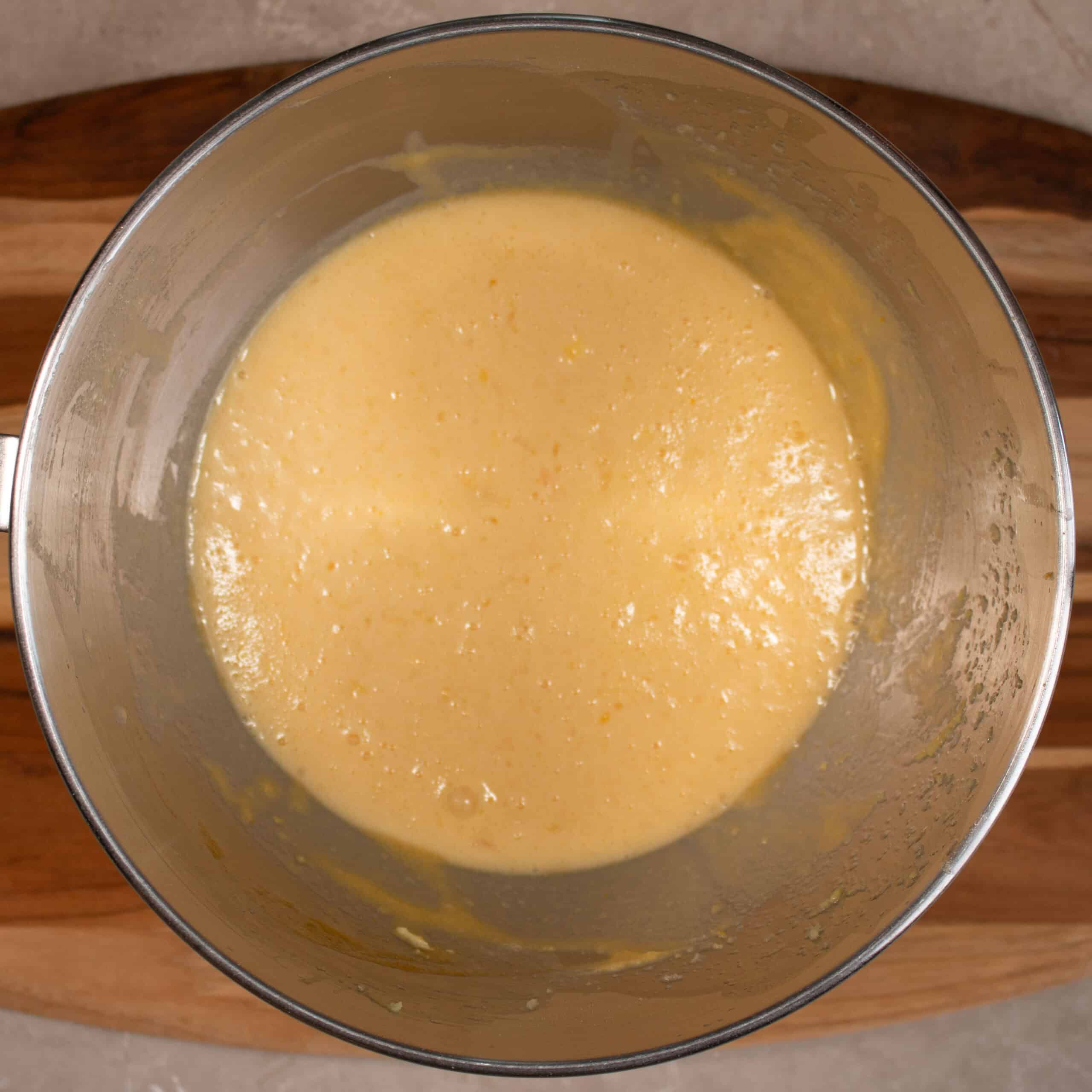 Step 3: Turn the mixer to speed 1 and add the lemon juice and rind to the egg mixture