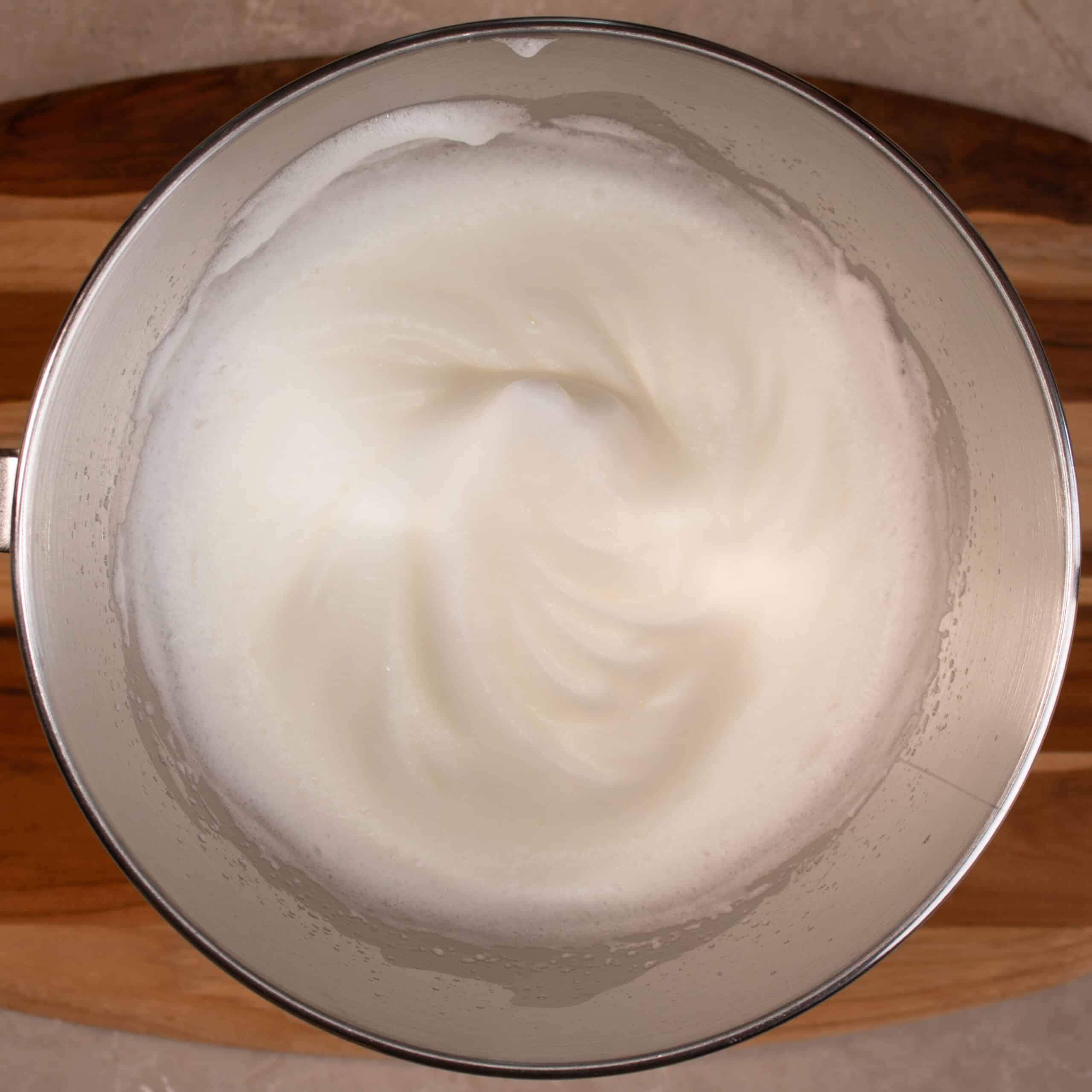 - In a clean dry bowl whisk the egg whites until stiff peaks form, do not overbeat them.