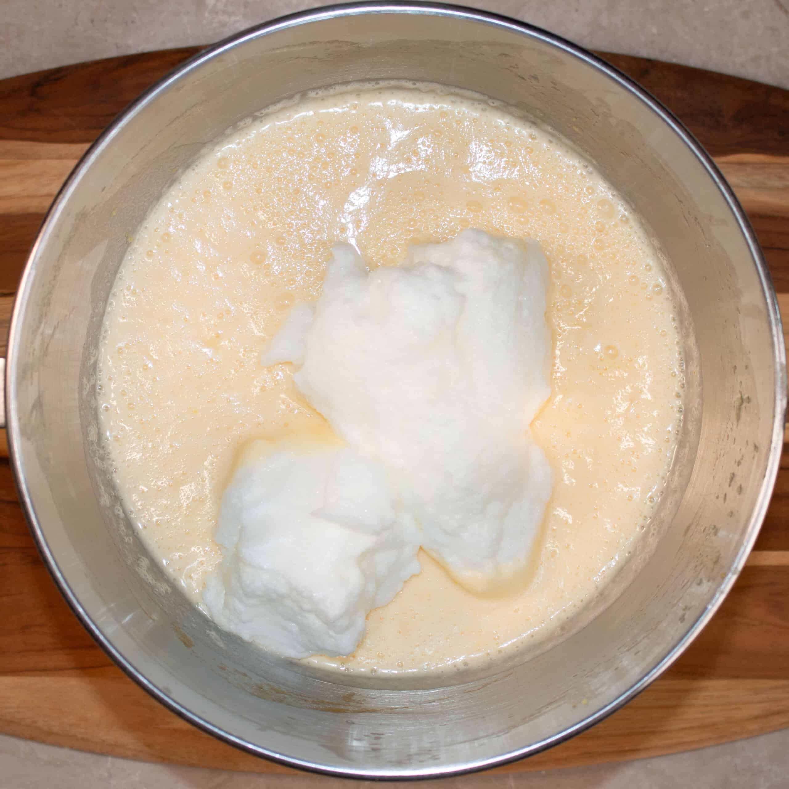 Step 9: Fold the egg whites in to the lemon mixture, you will want to add around a quarter at first. This will make it so easy to add the rest. When that is combined, fold through the remaining egg whites.