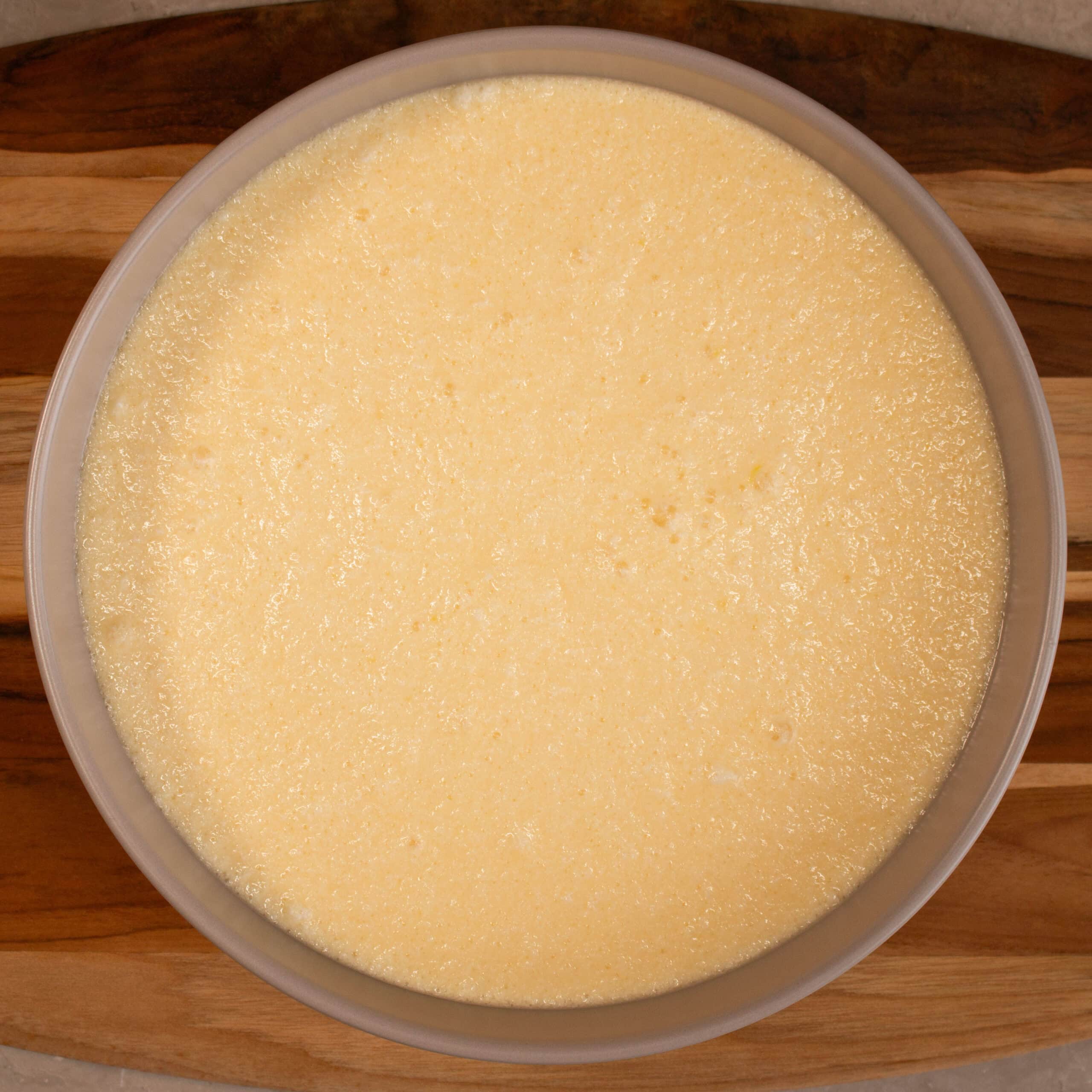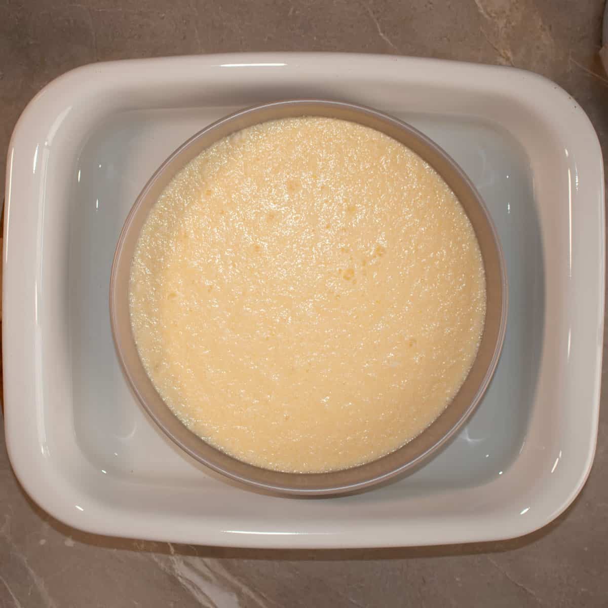 - Gently pour the batter in to your chosen dish. Place that dish inside your larger baking tray and pour warm water in to the larger tray so that it reaches half way up the side of your pudding dish.
