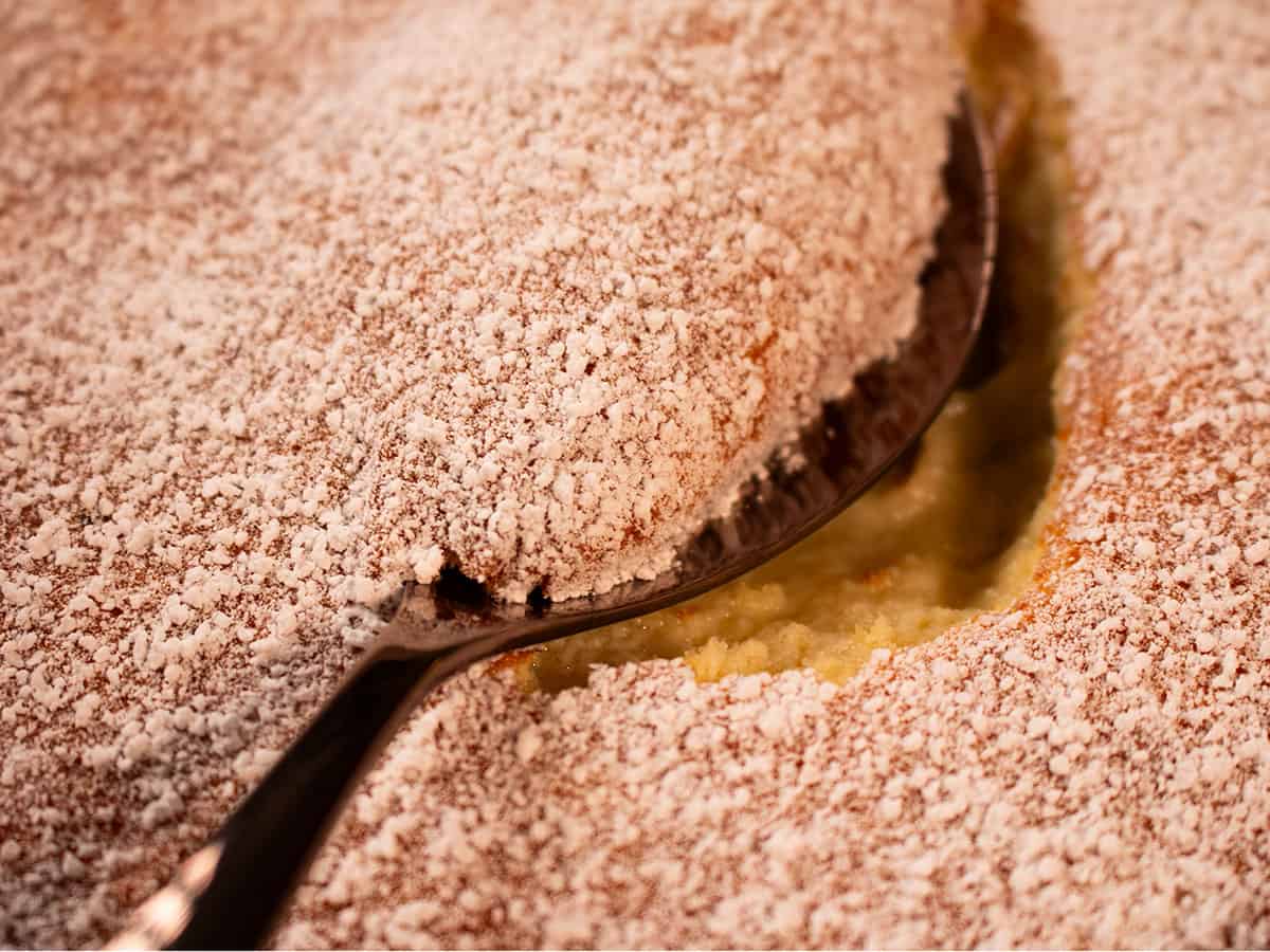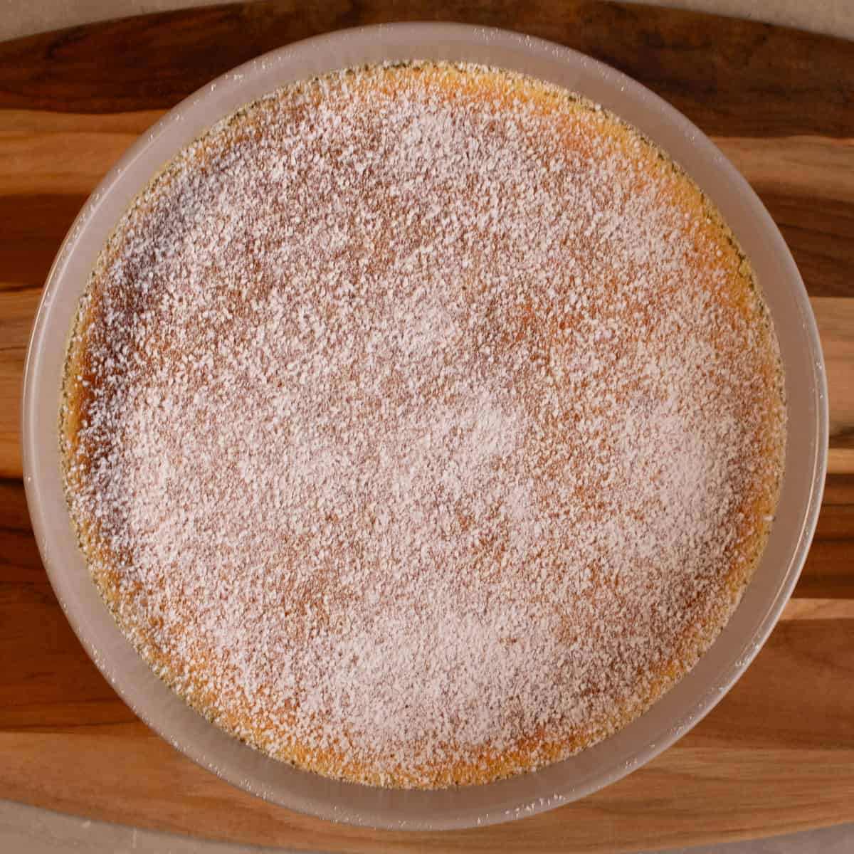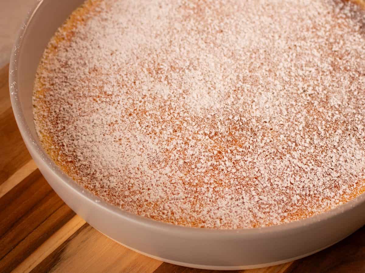 - Once cooked take it out of the oven and remove from the water bath, let it cool for 15 - 30 mins before dusting with icing sugar then serve